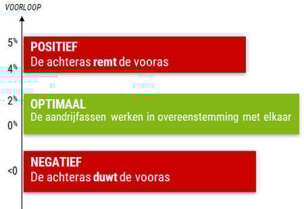 - De voorloop is minder dan 0%: de achteras duwt te veel ten opzichte van de vooras = slechtere overbrenging, sterke wielslip aan de achterkant van de tractor, efficiëntieverlies van de voorbrug, enz.